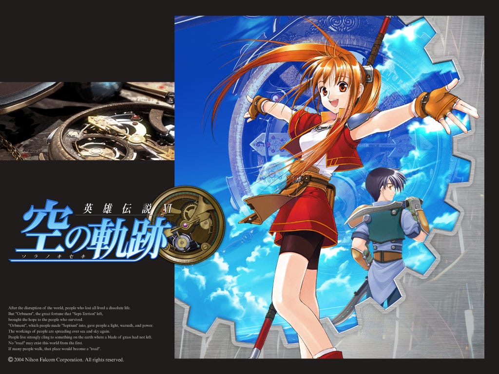 In June 2004, Nihon Falcom released The Legend of Heroes VI: Trails in the Sky (lacking the FC for First Chapter, which would be added later) for Windows 98/2000/ME/XP with the marketing tagline "忘れられない旅になる", or roughly "An unforgettable journey." The game takes place on the fictional continent of Zemuria, which has undergone a rapid technological and societal transformation as a result of the invention of Orbal technology, a sort of magic-energy hybrid that can be used to generate what we might recognize from fantasy fiction as magic, or alternatively, to power computers, airships, et cetera. This throws the world from a level of technology on par with the late Middle Ages/Early modern period to a what begins approaching modern levels--and beyond. Trails in the Sky follows new junior members of the Bracer Guild--a non-governmental community peacekeeping agency that spans the continent--on their journey of growth, discovery, and mystery through their homeland, the continent’s southwestern seaside Kingdom of Liberl.