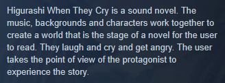 I hesitate on overstating here, and I realize this entire post is really giving Higurashi Chapter 1 Steam description, below if you're not sure what I'm referring to. That’s fully intentional.